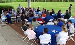 After enjoying a delicious buffet, attendees took advantage of the fine weather and friendly company to visit, toss Frisbees, and investigate the park's team of sociable ducks.