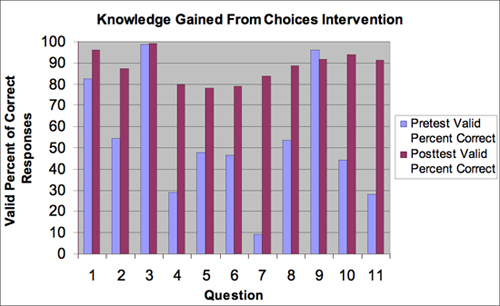 Since December 2005, 9626 students have participated in the Healthy Bodies, Healthy Minds program. This includes 877 students attending the alcohol/other drug sessions, 8,706 attending a late-night event, and 43 participating in a BASICS session. Countless more have been exposed to social norms posters and statistics. Pre and post-test data collected during the alcohol/other drug sessions have shown that students’ alcohol knowledge has increased, as has their perception of negative consequences pertaining to alcohol use, as shown in the table below. Furthermore, 66% of students who drink reported that attending a late-night event resulted in less drinking for them.